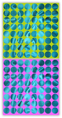 The images in my recent work are mostly overlaid patterns or circles superimposed on a background of solid color, blocks of color, woven stripes or subtle patterns. I paint in oil, usually on linen, as I prefer the tighter, smoother weave of linen.