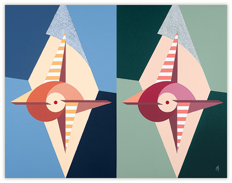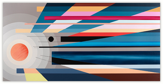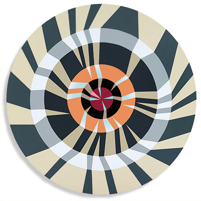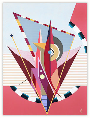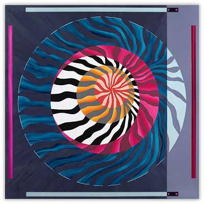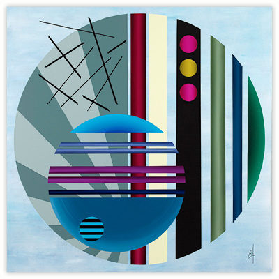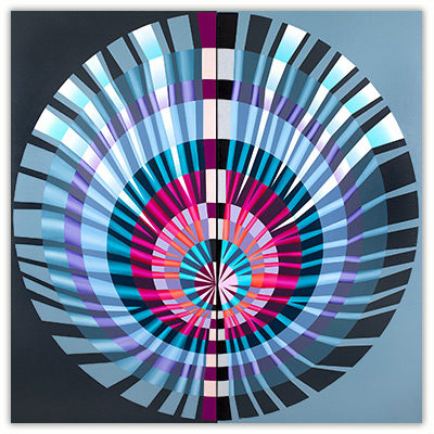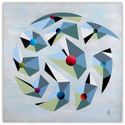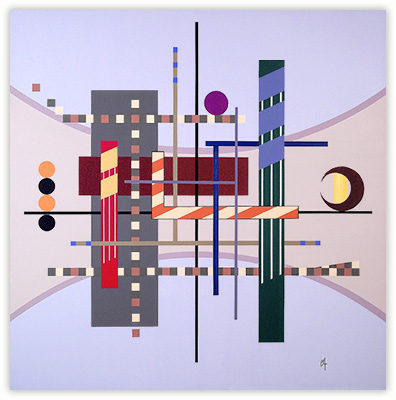 I like creating paintings where geometrical patterns interconnect and enter into dialogue, where regular flat-tints are dominant, perfectly circumscribed with lines drawn with set square and compass. I also like to experiment with colours and work with mixes, trying varying juxtapositions, blending tonalities since each touch of colour within the space of the canvas, even the most discrete, influences the overall perception of the painting.