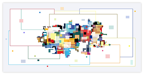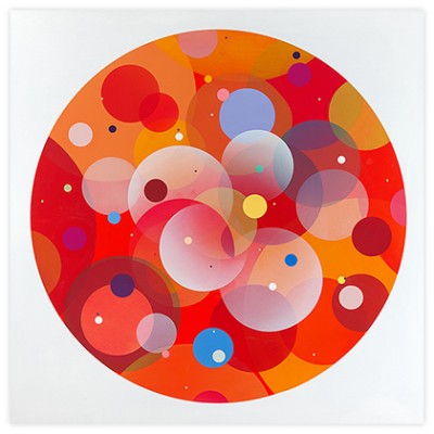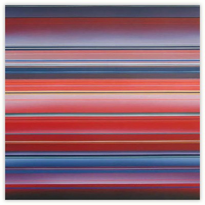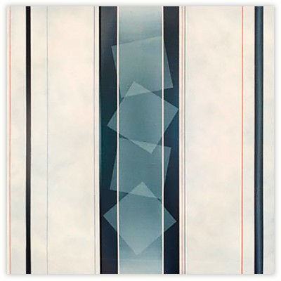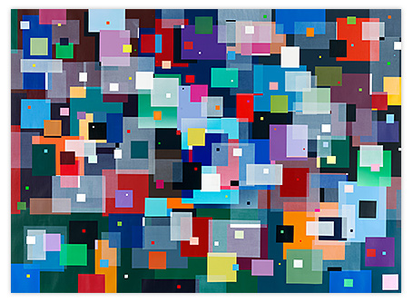 No irony. No cynicism. No hidden messages. No morality. Shapes persistently repeated, side by side or stacked. Wordless and silent images without a point of reference. No beginning and no end. All paths in and out of the images are open. Colors and shapes lead the viewer’s gaze, and the colors create movement, which the viewer follows. Shapes move; they both coalesce and separate. Transparency and overlap create multiple readings of what lies in front or behind.