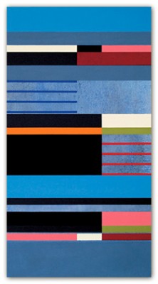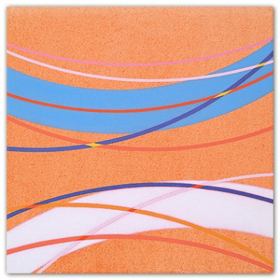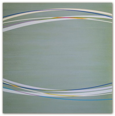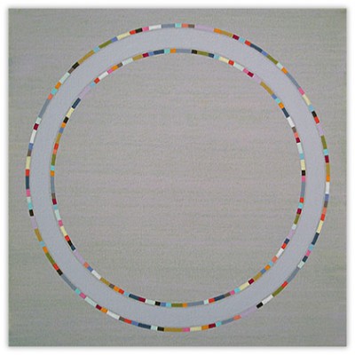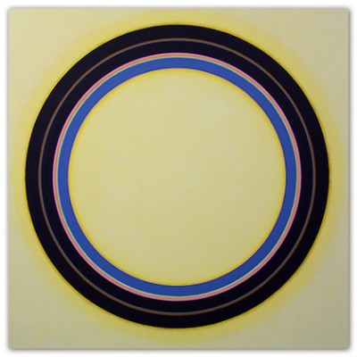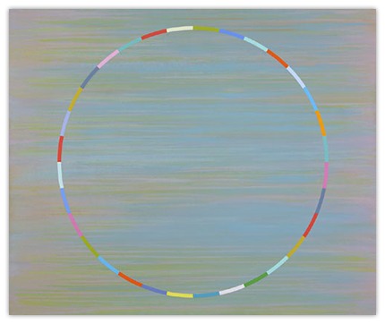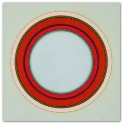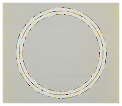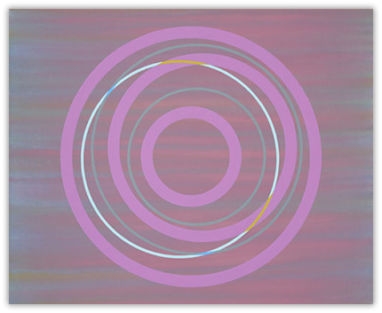 I use circular and striped motifs to summon ideas about music (Ragamala). This painting is based upon a poetic tradition in Indian painting meaning “garland of sound” and alludes to sound and music. The “raga” is a conventional pattern of melody and rhythm that forms the basis for freely interpreted compositions. I use this convention to make multiple references—to sound and vision, to time and place. Concentric formations replace the sequential, durational “whole.” Color provides contextual mood and energy.