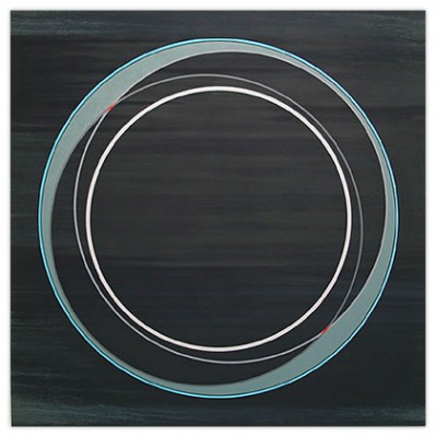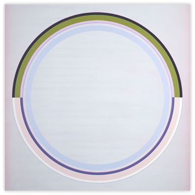 Recent work moves away from the self-contained order of earlier configurations towards a more informal relationship with architecture, landscape, nature and the environment. Only partial sequences of activity may be visible, with interruptions in registration suggesting transitory, fleeting impressions (Shift). The circle is no longer always complete or contained: colored arcs collide and cross over, briefly joined in connective flashes as they continue their independent trajectories (The Aviator and Alayrac #4). Atmospheric, poured pigment grounds provide both context and contrast for carefully over-painted multicolored geometric detail. Series of architectonic formations become equivalents for specific environments: a nighttime walk through London (Dark City Light City #1), a canal towpath (Canal Green Red) or the majestic incised rock faces of abandoned Balearic quarries (Quarry #16 /#17).
