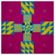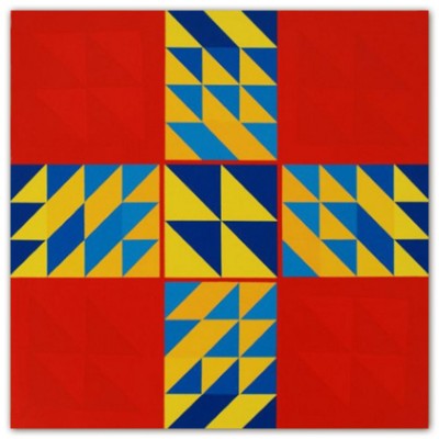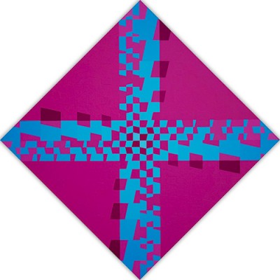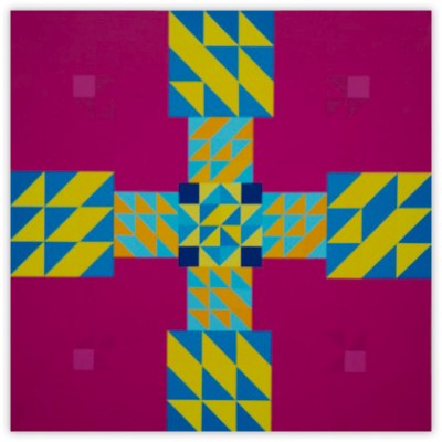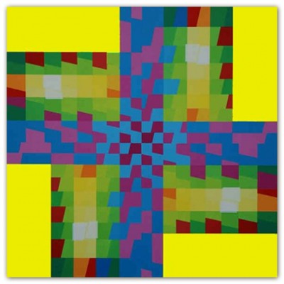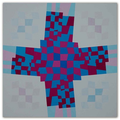 The paintings typically present a simple, emblematic shape—a cross, an “x” or a snowflake—which the casual observer will register as symmetrical by preconceived expectation. On closer scrutiny, a range of anomalies will be found. As either a help or a hindrance to such concentrated study, I will often paint in some of the afterimages likely to be generated by the higher contrast pattern sections—and, anyway, in the 21st century we expect everything on a plate, don’t we? This device is intended to promote an additional visual dynamic as the observer’s eye/brain seeks to reconcile actual and representational afterimages.