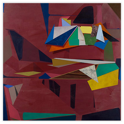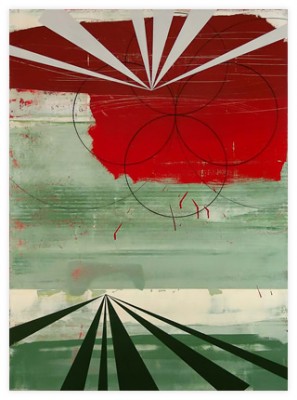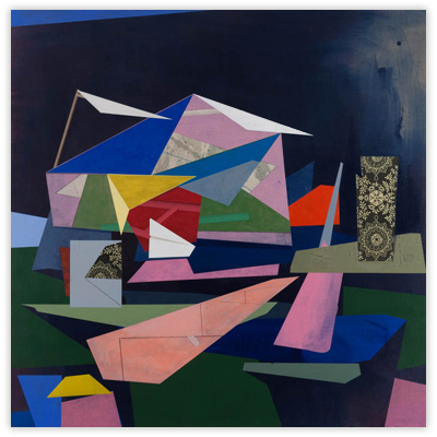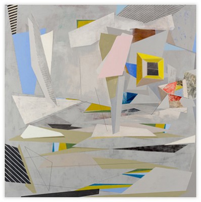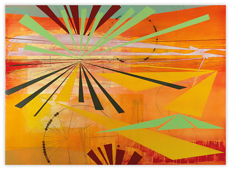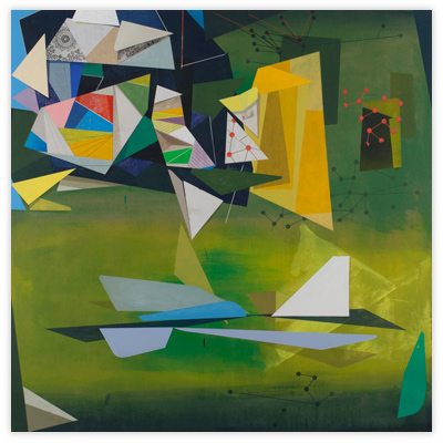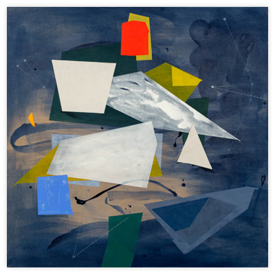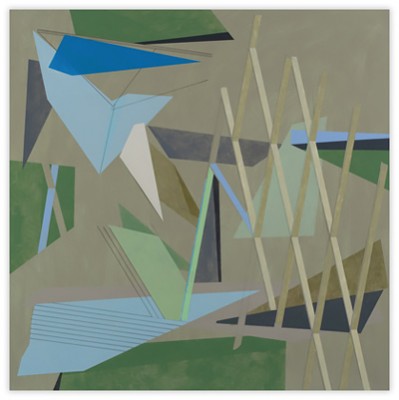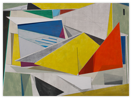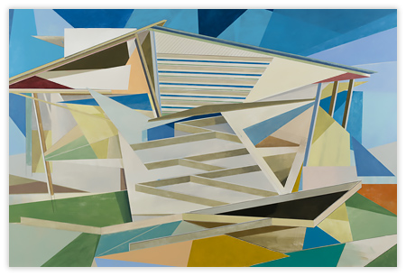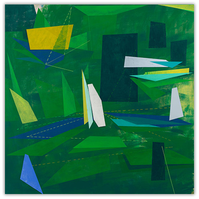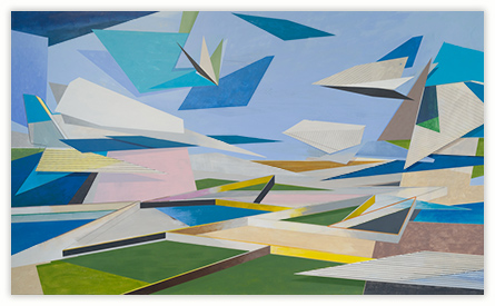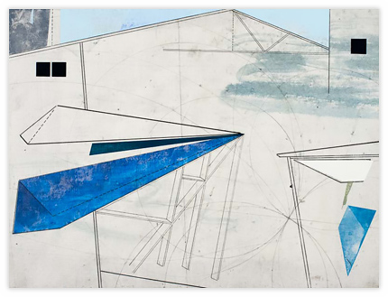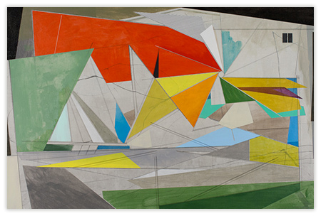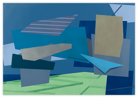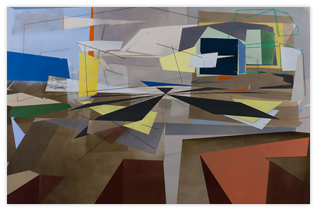My work is steeped in the role that technology, innovation, and environment play in shaping our relationship to our surroundings. By layering geometric planes and simple patterns on fields of rich color, I strive to convey depth, movement, and a shifting sense of place using the formal elements of painting. In the paintings, structures develop suggesting folded paper, fragments of wings, domestic dwellings or industrial buildings. I draw from childhood recollections of homes, construction sites in 1970s Dallas, and time spent in airplane hangars, visiting my father’s workplace. Planes of color crop up to create floors, wall-like surfaces, eaves and overhangs. Silhouettes evoke cranes, cables, and overpasses. However, these architectural notions do not remain whole; they fracture and fall away to reveal other chambers or the outside world. A simultaneity of interior and exterior space puts the depicted in the liminal, the in-between. This falling away opens up the paintings to a dynamic landscape with a sense of forces moving in many directions at once. My paintings reveal internal structure and order amidst the chaos. Despite the shifting and multitudinous spaces, the paintings ultimately resolve, achieving balance and stillness.