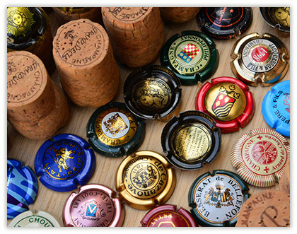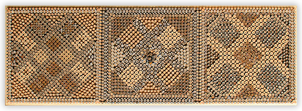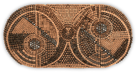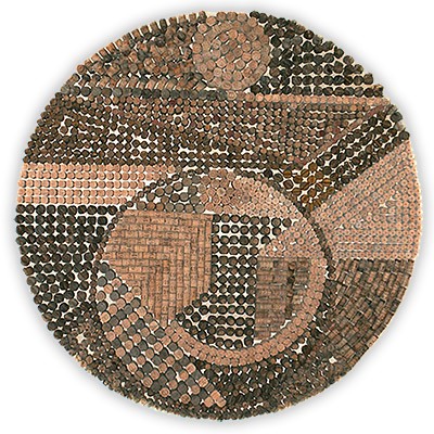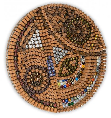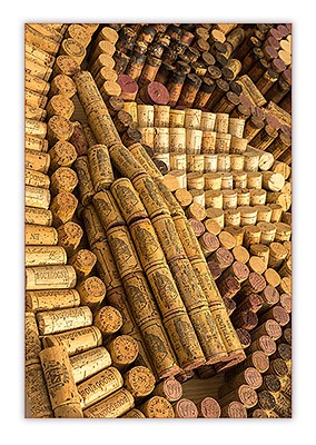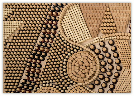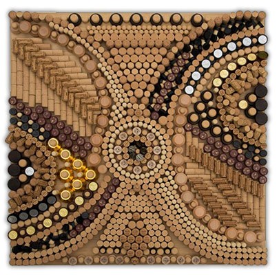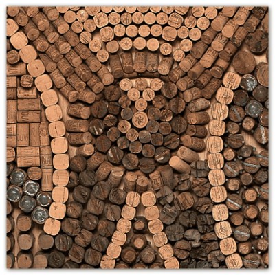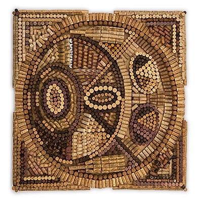 Aesthetically, I attempt to express ordinary objects—wine and champagne corks and labels—with their own unaltered attributes: functional shape, size, texture, natural hues, and even their imprints. The geometric process begins with small clusters of sorted materials selected from piles. These seem to align, to suggest curves and lines that often oppose each other, forging abstract, dynamic spaces. Within such spatial coordinates, patterns are completed with materials at hand.
