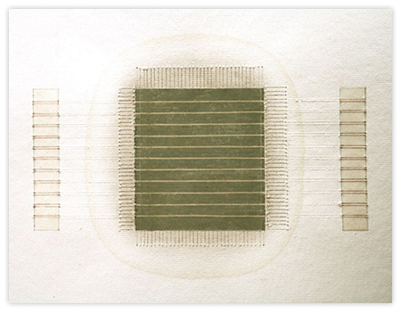 In the works on paper, organic and subtle color is applied in a highly diluted form in superimposed layers, each being allowed to dry before being overlaid by another. The watercolor forms a soft and blurred edge around the central geometric form, evoking the organic, while the geometry establishes an insistent sense of order. The forms float both spatially and in their relationship to the paper’s edge. There is something of aerial views or architectural plans about many of them, and there is the suggestion of the allusion to open space seen from a distance, far beyond the parameters of the paper.