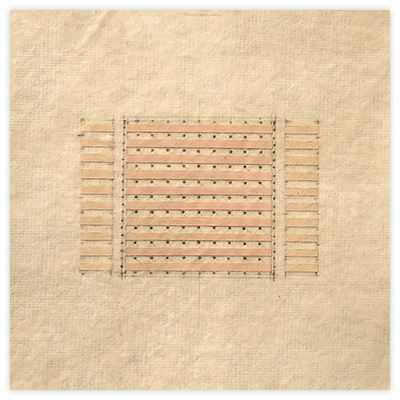 The relationship between the back and the front of the work is made by pinpricks which are used in addition to pencil marks to demarcate and divide. The pinpricks bring to mind those making skills predominantly used by women which utilize pins and thread.