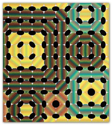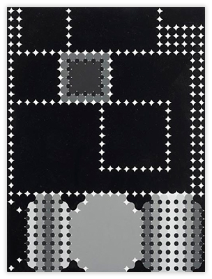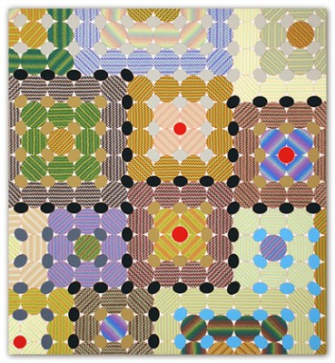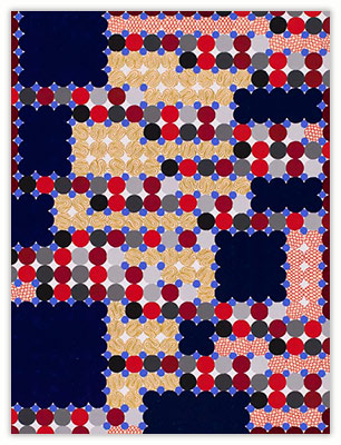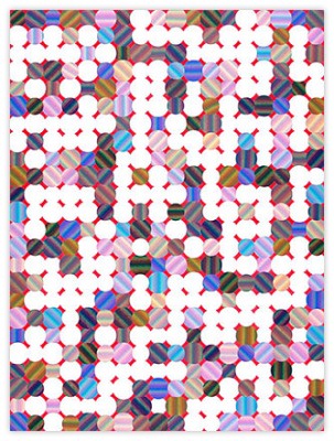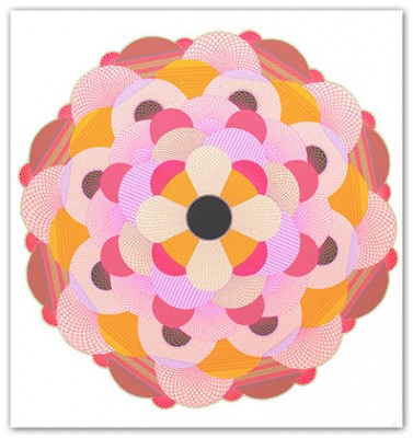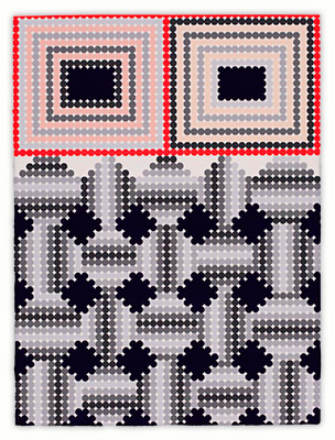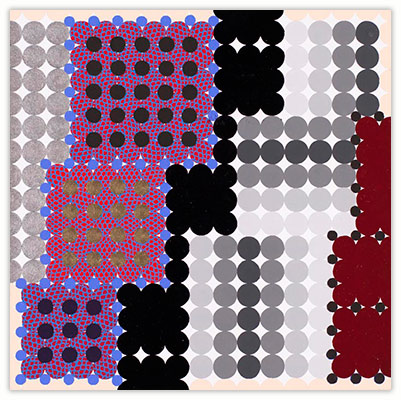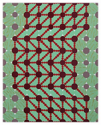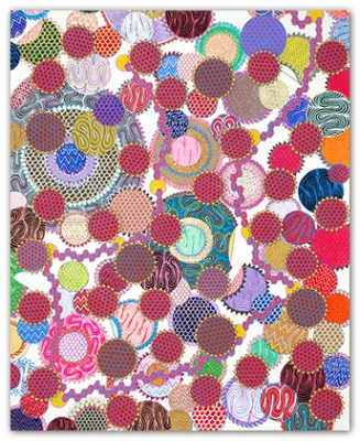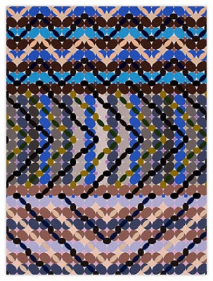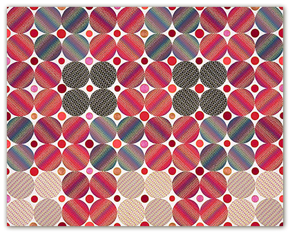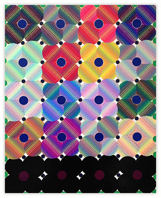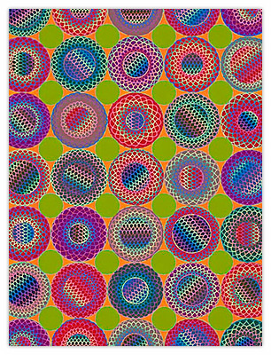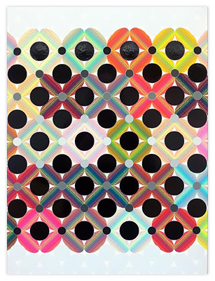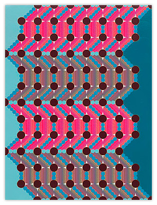 Over the past few years I have been using a series of small geometric shapes to form fields of brightly colored, abstract images drawn with gel pens on a variety of papers. These often include collaged elements or shapes painted in gouache. This limited vocabulary of hand drawn marks and simple shapes is brought to a horror vacui fever pitch, leaving the viewer caught in a dizzying haze. Geometry, though still present, is softened or dissolved to varying degrees by scales, spikes and swirls of overlapping color.