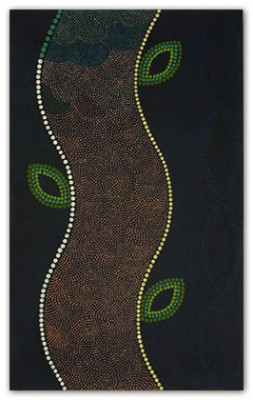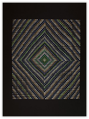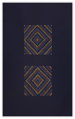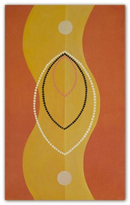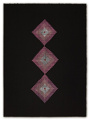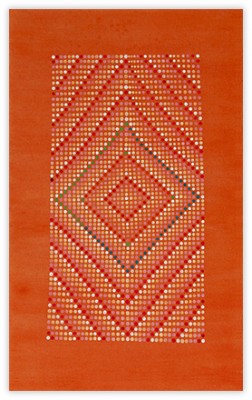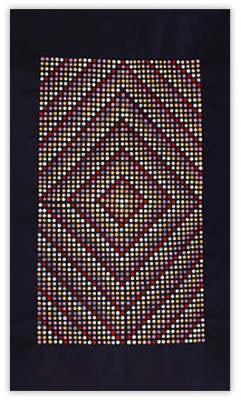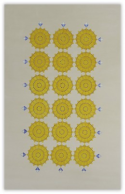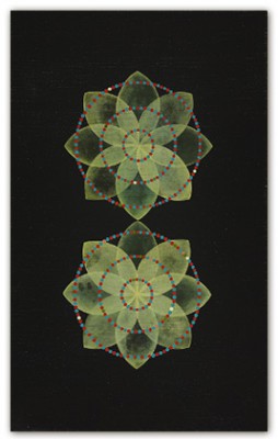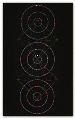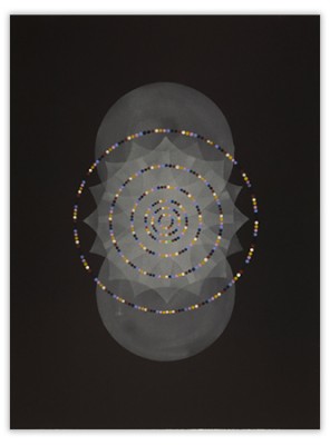 On an inviolable ground of many layers of transparent color, the central images are rendered through a deliberate accretion of dots and beads of color. This labor-intensive working process reflects and supports the recurrent themes of ritual, growth and the passage of time.