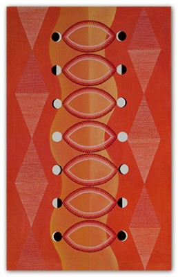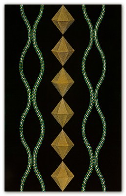 My studio practice is an intuitive one of identifying and depicting images that are both iconic and numinous. Through research, the significance of an image in various cultures is revealed, providing meaning and context for my work. A list of the symbols appearing in my recent work includes: rivers, braids, vines, diamonds, tongues, fountains, waves, cubes, the vesica piscis and the phases of the moon.