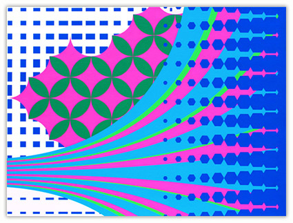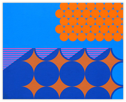 My interest in minimalist art—a compositional strategy that relies on essential elements— has inspired me to produce nonrepresentational, geometric paintings with colorful curves and interlocking shapes.