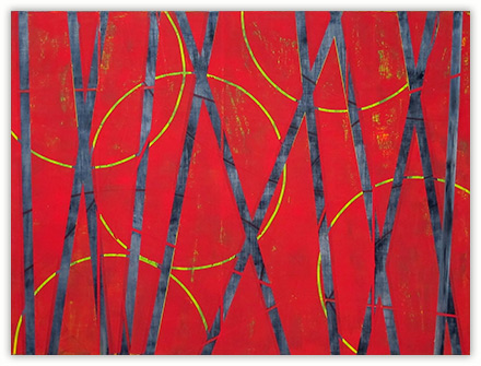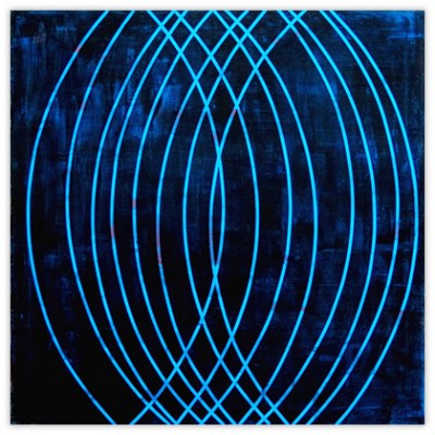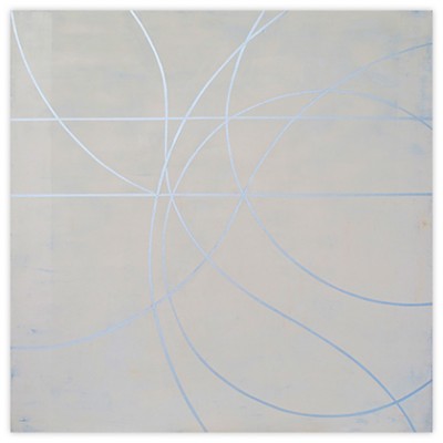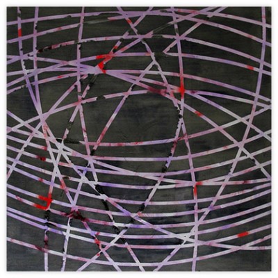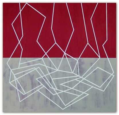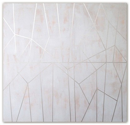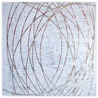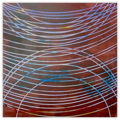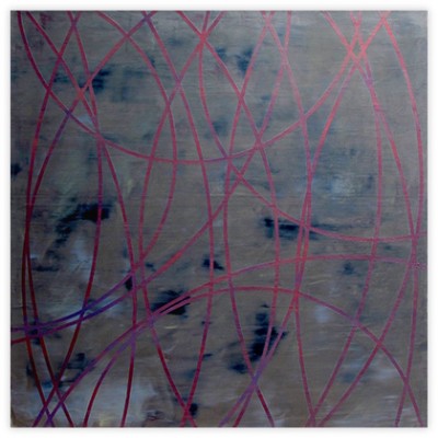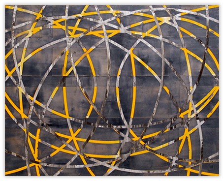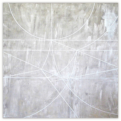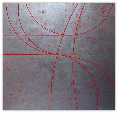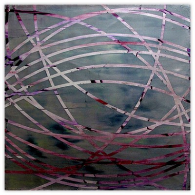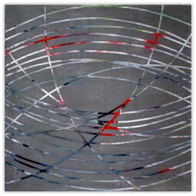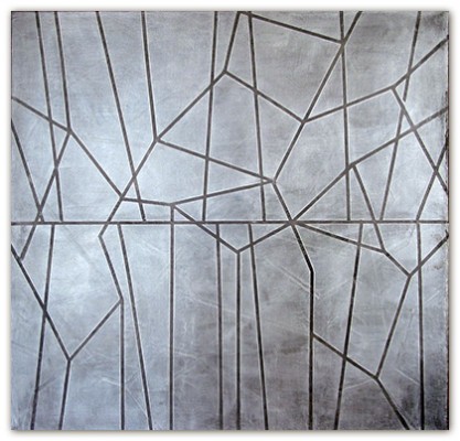 Since the beginning of 2006, my work has again markedly changed, the horizontal and the vertical lines have almost completely disappeared, angled lines over arbitrarily layered color fields give structure and a sense of motion, even more pronounced by my use of aluminum paint, which changes from bright light to a dark grey, giving the surface multi-dimensionality, a kinetic quality.