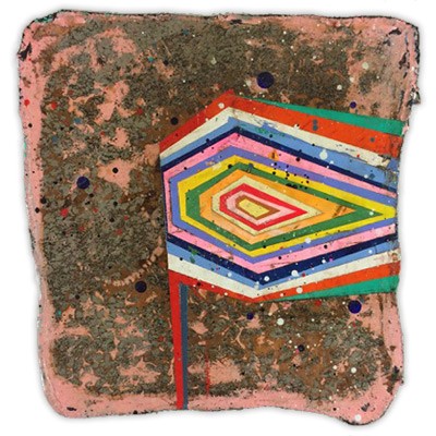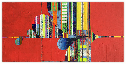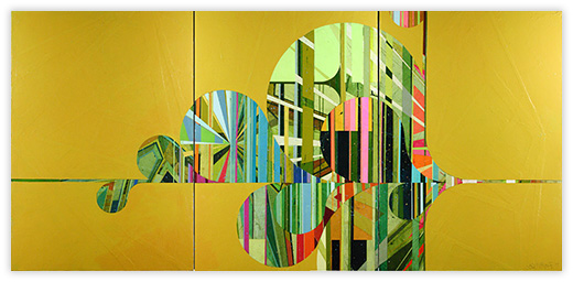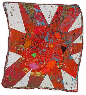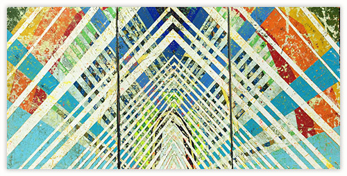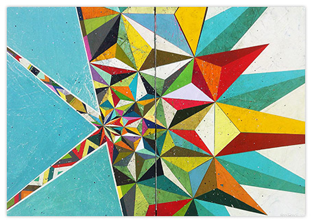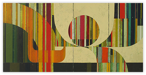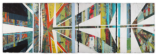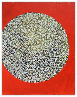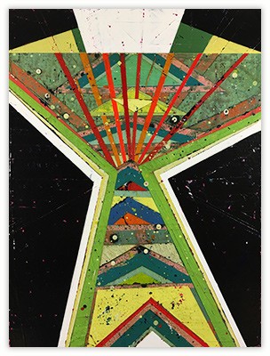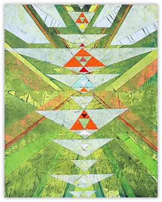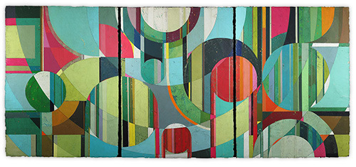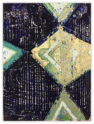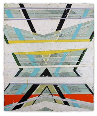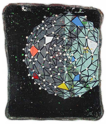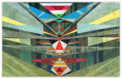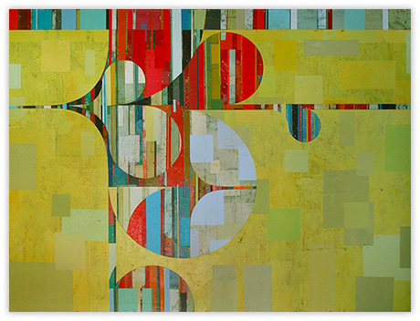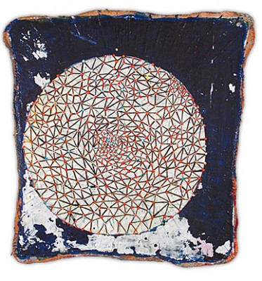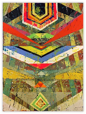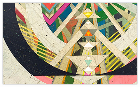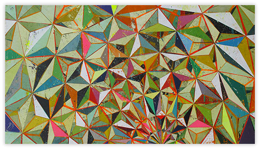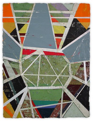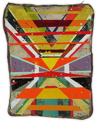 In a confluence of forms, I will develop lines and planes of color to delineate an intuitively created space. Almost in an effort to stamp some order in the chaos, geometric shapes will blanket the underpainting’s more organic textures. Relief pushes up from the underpainting, betraying the order, and light raking the surface reveals tension between the two. By drawing geometric maps into the work in ballpoint pen, I can assume the role of cartographer as well. The ink has the amazing ability to migrate up through multiple layers of acrylic, and, even if covered, will later reveal an earlier intention. It has the effect of allowing me to have a conversation with an earlier version of myself—a crude form of time travel perhaps.