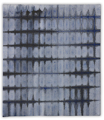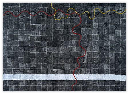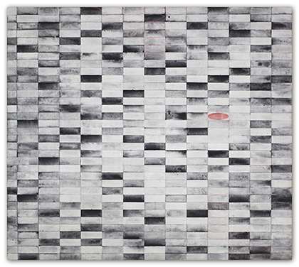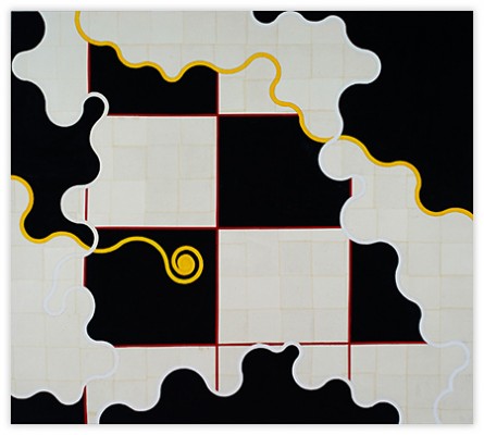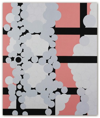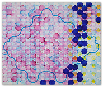 In these works, I have forged a system over structure, not simply by deploying shifts in pattern, color and materials or by working differently with the physicality of density, layers and collision. Meaning is derived from reference and form, such as when one considers the micro/macro parallel relationships in these paintings. Are we examining under a microscope or gazing at something barely decipherable, from a distance? Is what is being observed, derived from reference and form, from seeing the meniscus of the cell or the decision to remove color from the ground? Living within our information-driven society, I have taken the time to gesture towards this bombardment of information as well as our attempts to carve out personal space within the pressure-driven urban setting. The forms in the paintings take note of all this, authorizing a space so that space and paint are one.