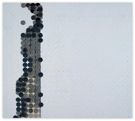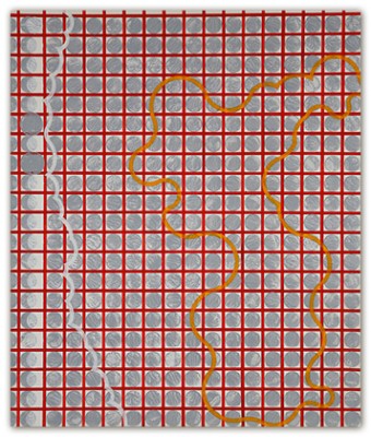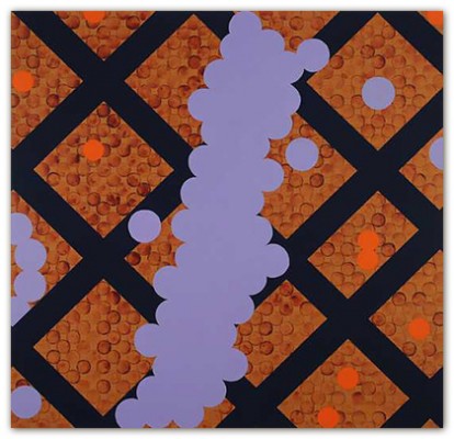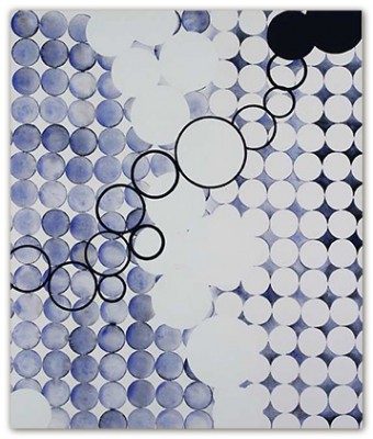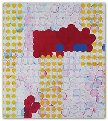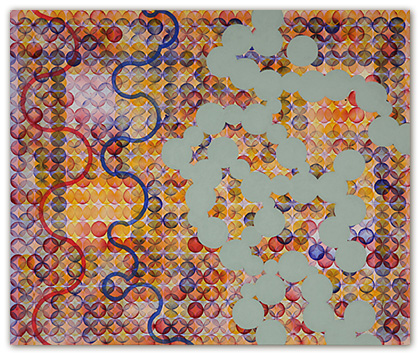 The recent works reflect the continued circle and grid relationship; however, through a manipulation of color and spatial elements, the circle and grid are systematically broken down by the tension of a push—pull scenario. In addition, by changing the scale of the circles in breaking the grid, I have created a new visual vocabulary. In creating these works, I am interested in exploring the many possible configurations and the relationships of the elements within the canvas plane in order to create an emotional and visual experience. More recently completed works begin to introduce the further deconstruction of the grid and the regrouping of the circle. Ultimately, it is the depth of possibilities that the circle, grid and color present that is of the utmost importance to the work.