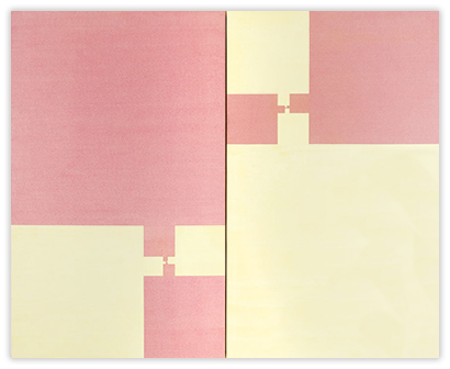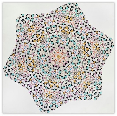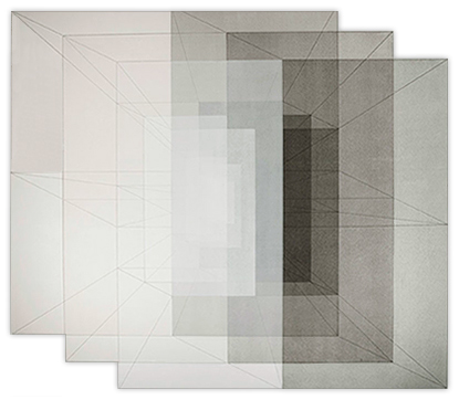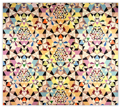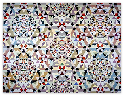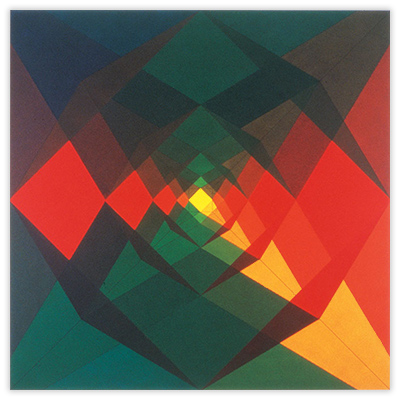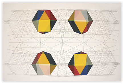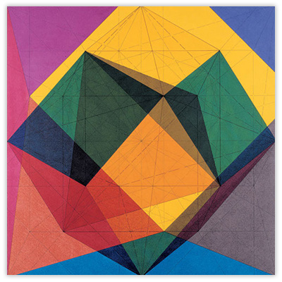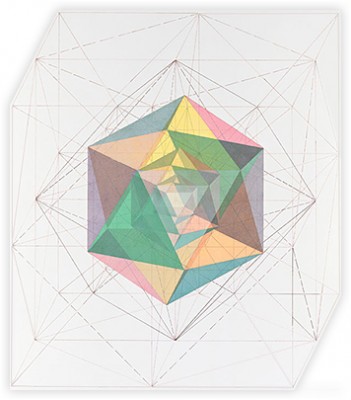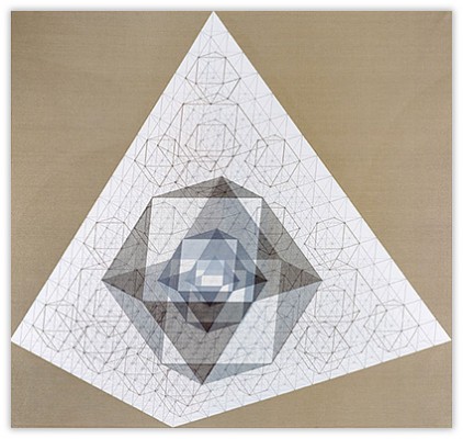 Transparency is the key to the visual effect. The process of layering transparent paint plays with the formal constraints of painting. Geometric forms are perceived as flat like the picture plane, and are also perceived as volumetric, allowing the eye to enter to the focal center or nucleus of the complex polyhedral construction. “Passages” or the linkage of planes, which occurs with the layering allows the viewer to perceive geometries as both self-contained and constantly shifting. The comprehension of the form is linear and concrete, yet translucent and tenuous. These oppositions reveal the structure as process; and process, in turn, is inseparable from time. Time makes the concept of physical and spiritual transport complete!