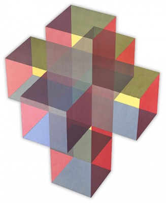Throughout the history of art, geometry has been equated with perfection of natural order, and light has been perceived as the vehicle for spiritual transport. My work continues this tradition, using polyhedrons as a metaphor for nature (as “spatial panorama”), and color as a mode of transcendence. By transport I mean movement of the eye through the picture plane; by transcendence I mean going beyond the limitations of opaque oil paint through the use of transparent pigments. Thus the viewer is provided a “window of transport” through space, into the nucleus, and thus into infinity.