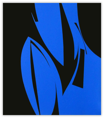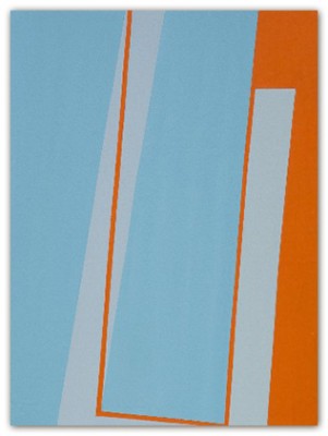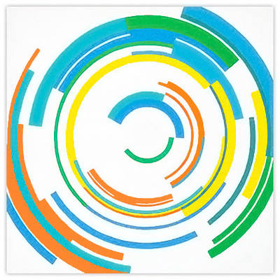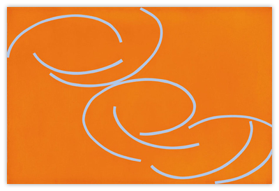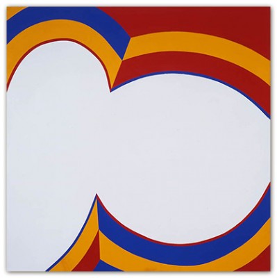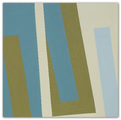 My early paintings from the 50s and 60s reflect my formal training at Syracuse University. They derived from colored paper collages—the images retaining the same rigid, hard edges, then translated into acrylic paint on canvas. The flat shapes themselves abut each other and read both as negative and positive shapes, which art critic, Jules Langsner, later to be my husband, referred to as “interlocking colorforms.” The forms (or shapes) I used were non-objective—that is, having no reference to nature—comprised at first of vertical, horizontal and diagonal edges—that is, angular, jagged, wedged, etc., and then curved shapes—elliptical, looping, ovoid, etc.