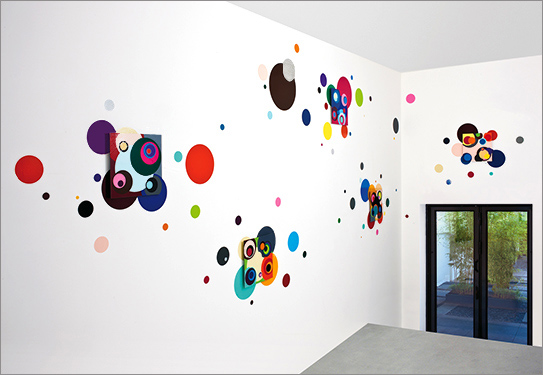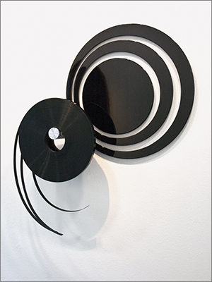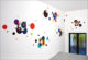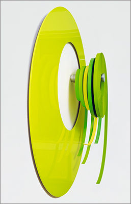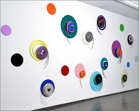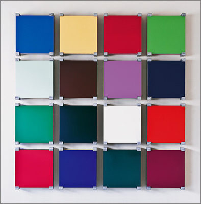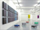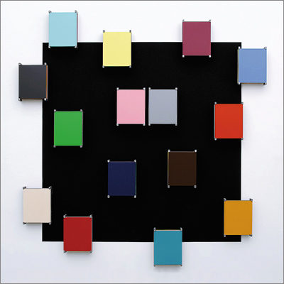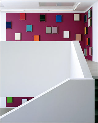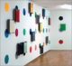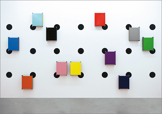 Wall-painted, glued and mounted different colored figurations are in dialogue with archival and storage systems, brackets, color plates and tapes, which are placed on or beside them. The interplay of regular geometrical forms builds up a rhythmic, stereoscopic sound which, in the context of synaesthetic perception, brings a polyphonic complete work of art into view.