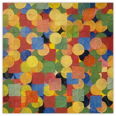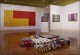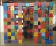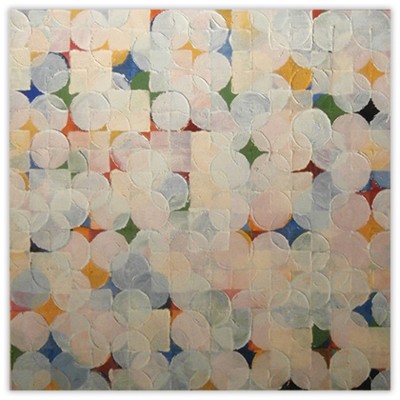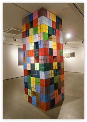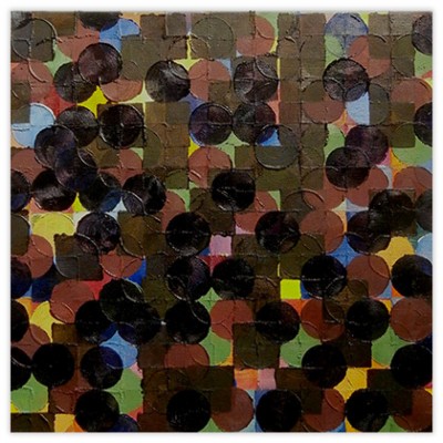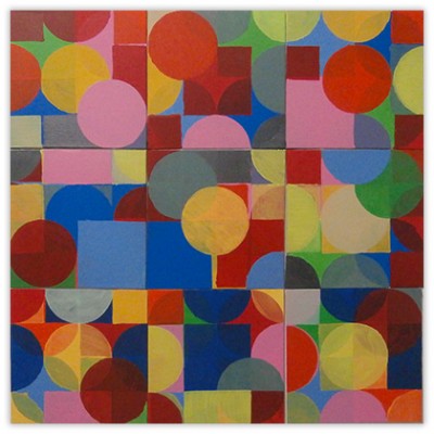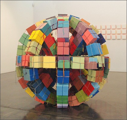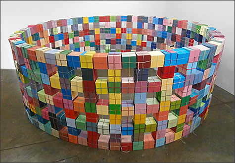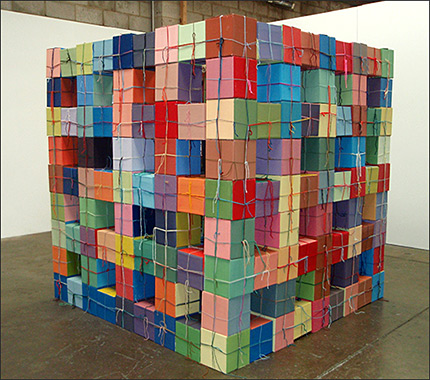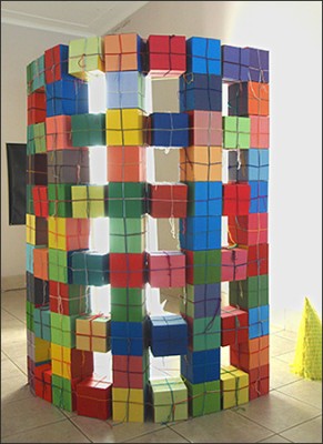 The paintings are created with the use of simple square and circle stencils that are repeated in random combinations. The sculptures consist of painted cardboard cubes that are tied together with yarn enabling the construction of limitless arrangements.