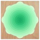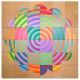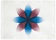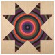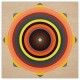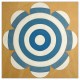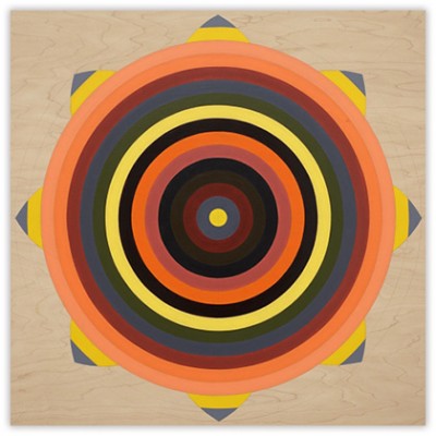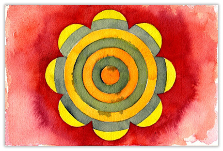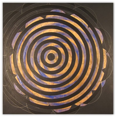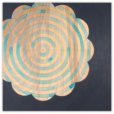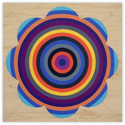The image is centered on a wood panel, with the petals of the flower growing out of the largest circle, pressing almost to the outer edge of the support. The colors shift and alternate from darker and/or more saturated hues to gradually becoming lighter in some rings. The color steps create a viewing experience that is surprisingly slow, considering how limited the palette at first appears. The circles are precisely drawn in pencil with a compass and ruler. The acrylic paint is opaque and flat, carefully brushed on the plywood panel after it is coated with clear matte medium. No masking tape is used.