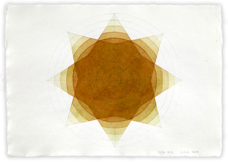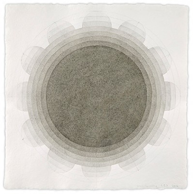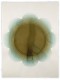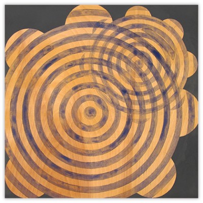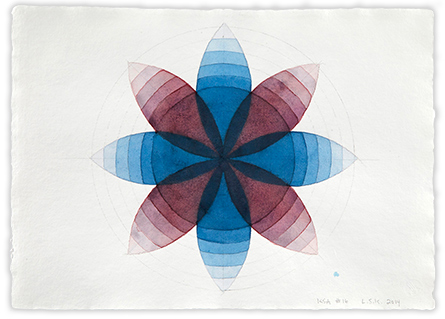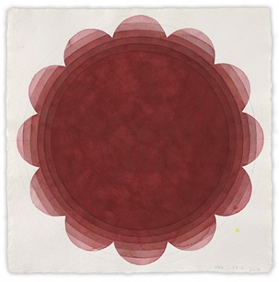 While working on the paintings on wood I have concurrently developed a series of watercolor paintings. The works on paper present a soft, attenuated visual experience. Although the watercolor paintings are monochromatic, they can appear polychromatic because the layered washes create saturated centers and progressively lighter outer rings. The paper around the image is left unpainted and the drawing process is made evident by the residual lines of graphite. The bloom of watercolor washes, where pigment hugs the edges of pools of water as they dry, functions like the organic lines and shapes of the wood grain in the panel paintings. The viewing experience is both numinous and luminous.
