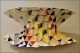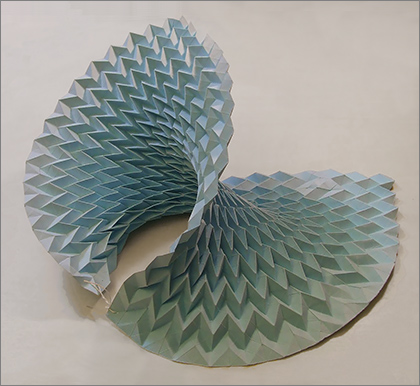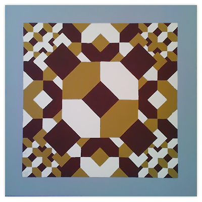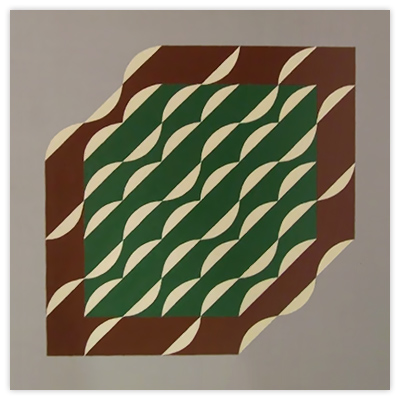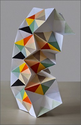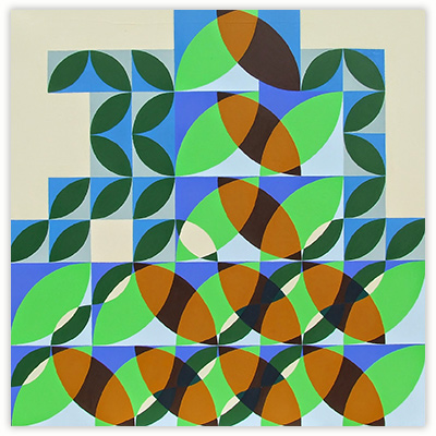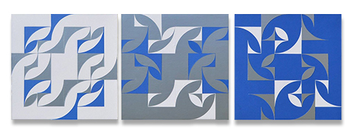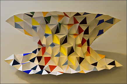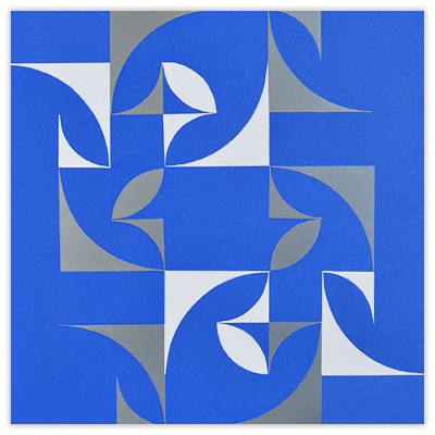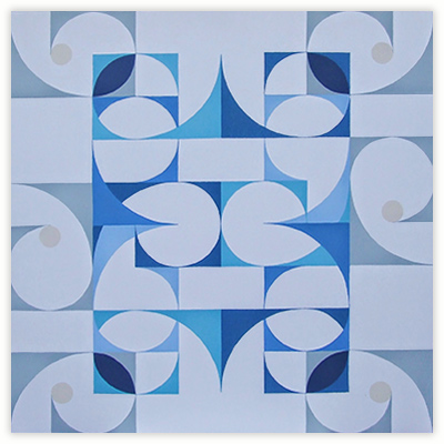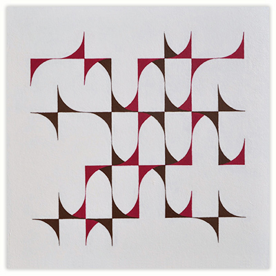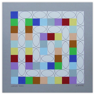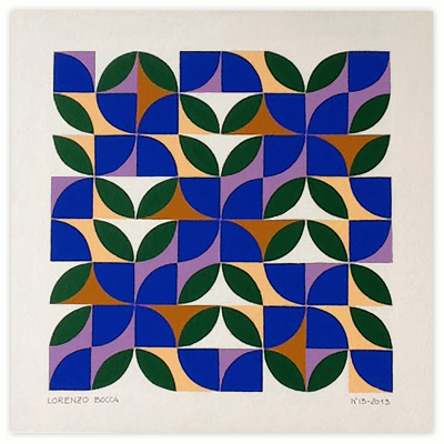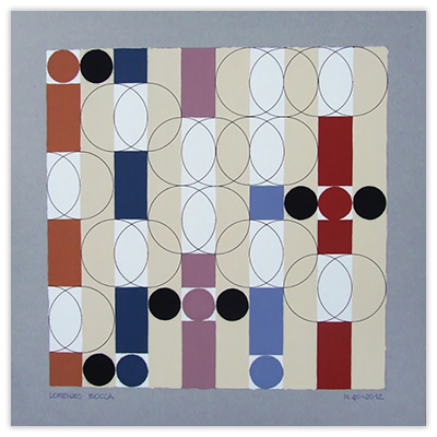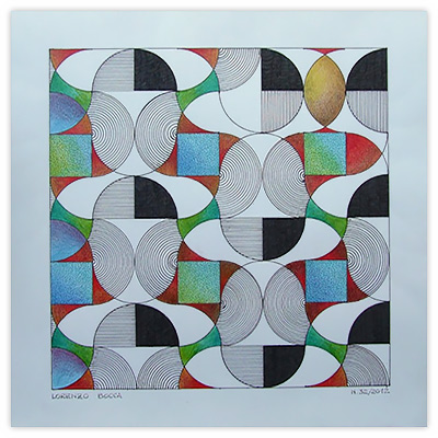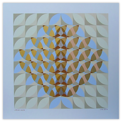 I assimilated geometry—the basis of my compositions— via the architecture of Francesco Borromini, the ideas of Escher, and finally arriving at studies of rotational and bionic geometry made by Italian researcher, Giorgio Scarpa. I recognize line as the basis of my research, adhering to the pronouncement of the ancient Greek painter, Apelles, “Not a day without a line drawn.” I work in acrylics on wood and paper and in collage. I also create sculptures from paper folded diagonally and longitudinally, also painted in acrylics.