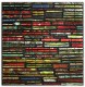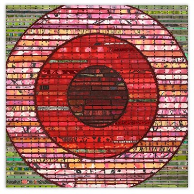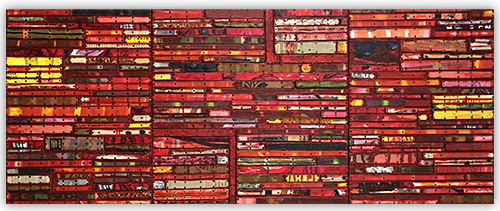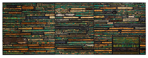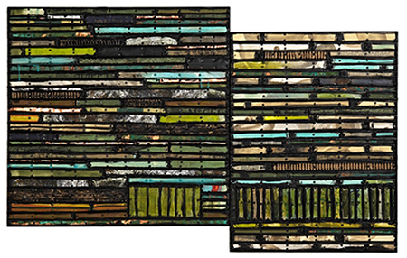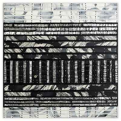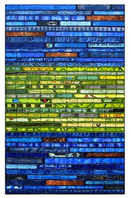 Geometry organizes my love of materials and process into coherent forms. My Running Stitch series, for example, may be understood as referencing memory, or at least the way we think about memory as a series of events, observations and experiences framed by time. This series celebrates the horizontal lines of fences, roads, tiles, maps and marks. Book titles and text from record albums juxtapose messages and provide tags for interpretation by readers. I use multitudes of tacks to attach the strips I cut from various materials. Tacks catch the light and provide a counterpointed rhythm to the horizontality of the strips.