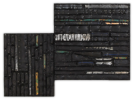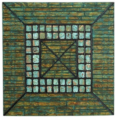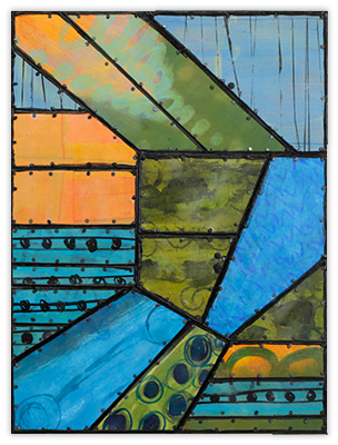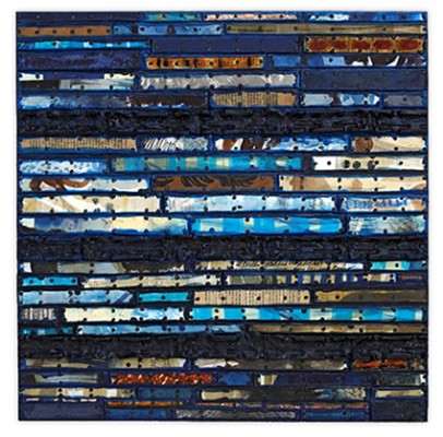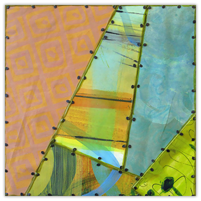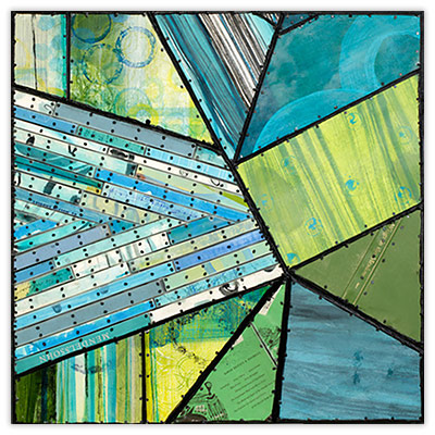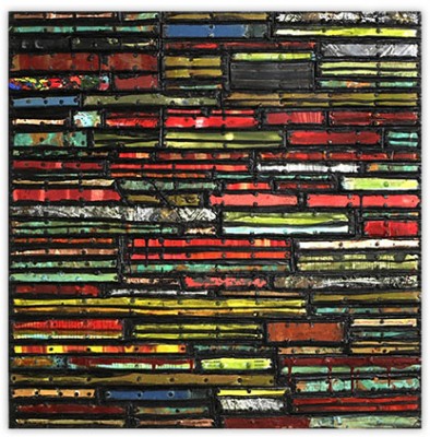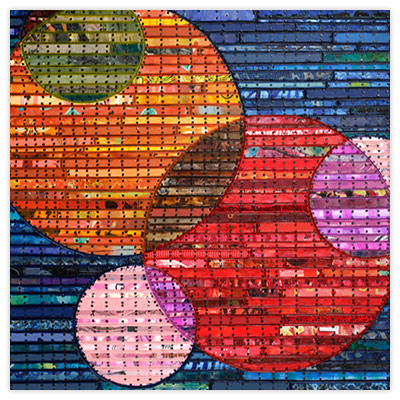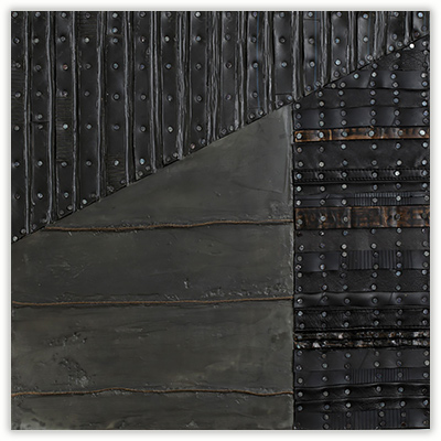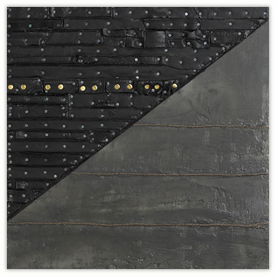 In other series, found and unconventional materials such as rubber from inner tubes and leather from discarded handbags bring to the works their connection to former uses and add dimension, both literal and figurative. Treated metal adds shimmer and variety as well as a patina of wear or age. Destruction of the original objects and transformation into the new works of art allude to my history of process and increase the mix of color, pattern, and texture.