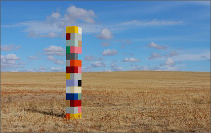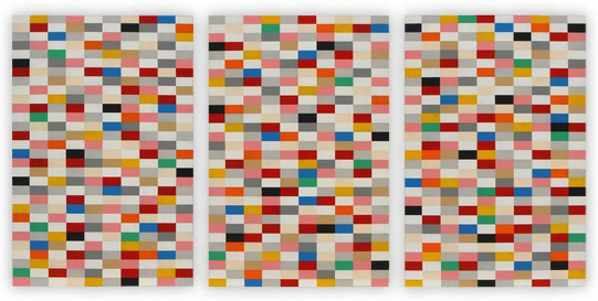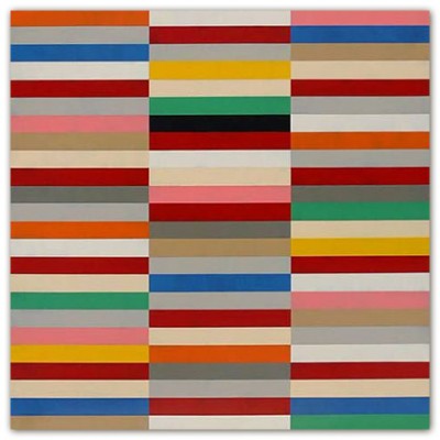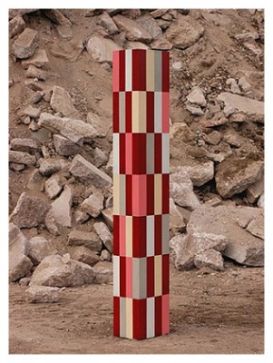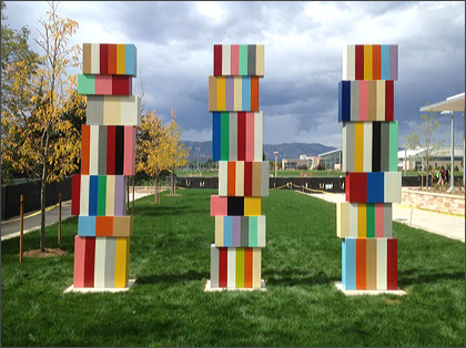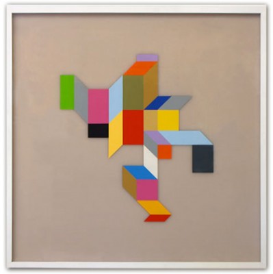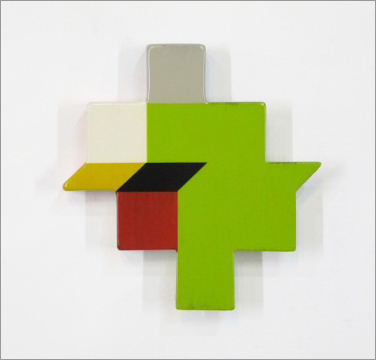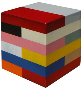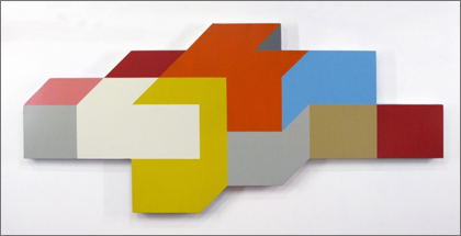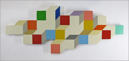 To create one of my works, I weld sheets of aluminum into box-like forms. That is to say, unglazed, they appear first and foremost as solid and dimensional. Each color is individually hand brushed pigment. Then I fire the pigment in an oven, a process similar to glazing ceramics. Each color must be fired separately in order not to contaminate its neighboring color.