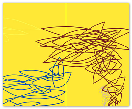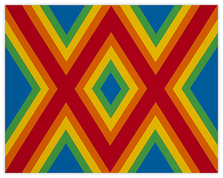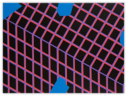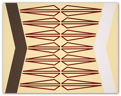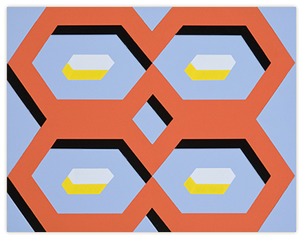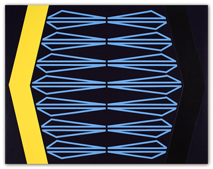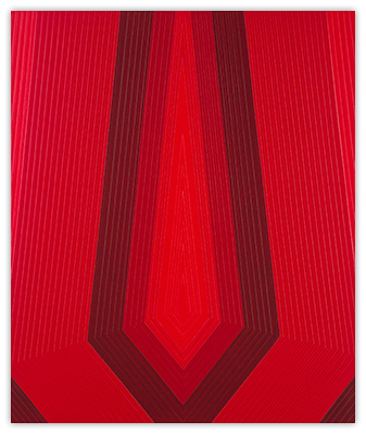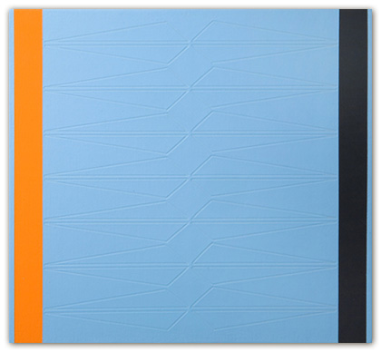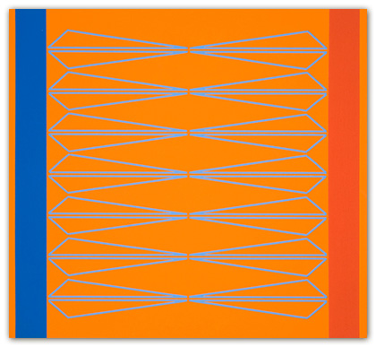 In hopes of keeping the work well thought-out and fresh, I constantly search for a balance between contrived and arbitrary. This gives me an intuitive “just right” feeling about the work. Nuances may be found within the brushwork. With the exception of tape, the paintings are constructed by hand without geometrical tools or spray applications. Tape is used as a drawing tool, cautiously applied to the painting surface to prevent bleeding of the paint. This allows an acute interaction of color. The work is assembled with many thin layers of paint by way of cross-hatched brush strokes in hopes of creating a physical substance to the painting. The overall aesthetic favors a reductive, minimalist bent coupled with physicality.