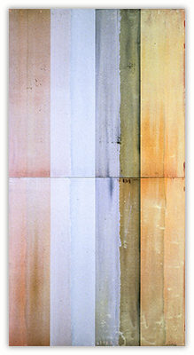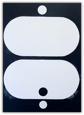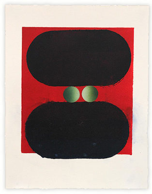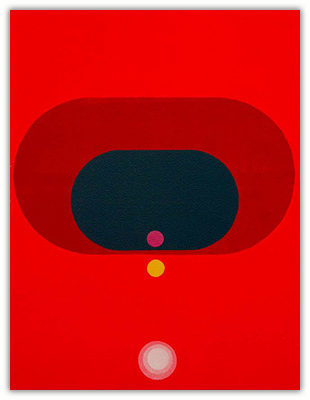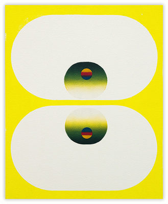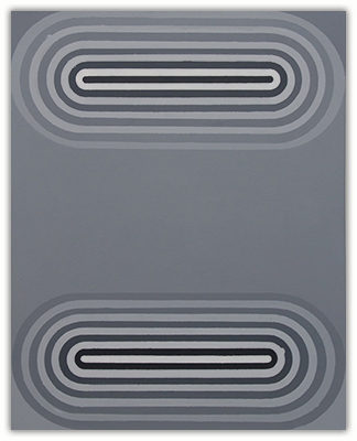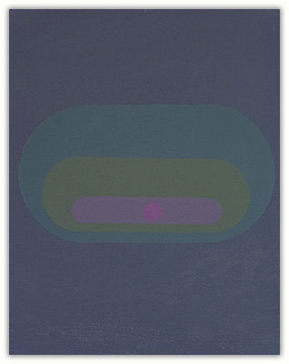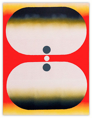 I currently work with a vocabulary of simple rounded shapes, fields of (mostly) flat color and the character of a painted edge. I use stencils, paint rollers and spray paint that allow me to cover large areas with a single attentive movement as well as serving a preference for minimizing the presence of my hand. Rather than cleanly delineating shape, I work with edges that are often “imperfect” due to the process of using a stencil on a canvas surface and the bleeding of paint that can occur. Accidental edges can have something of a life of their own. In my recent painting I work off a central vertical axis, but with a non-measured placement of shapes that can produce slight and unexpected asymmetries. Forms begin to suggest their own universe of gravitational repulsion and attraction, compression and expansion. Although I start with a plan, I tend to “play it by ear,” and sometimes the paintings move elsewhere. My response to both the the material in my hand and the color is always a factor in the direction a work takes.