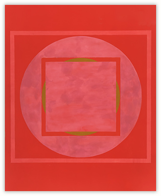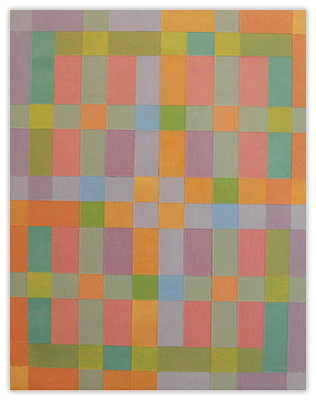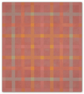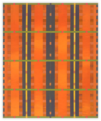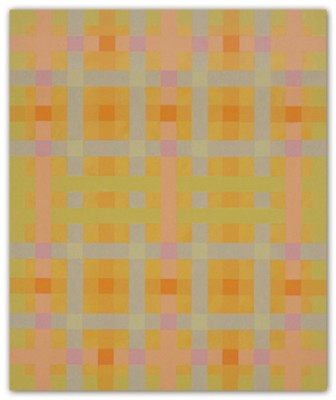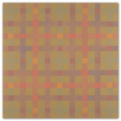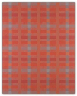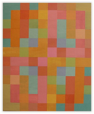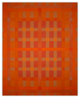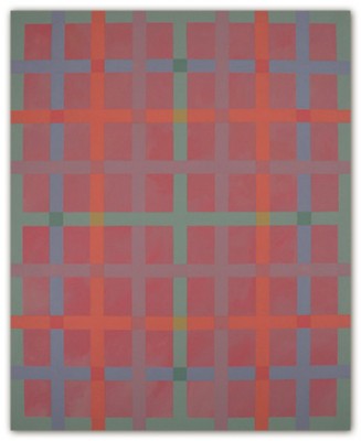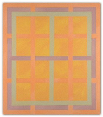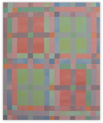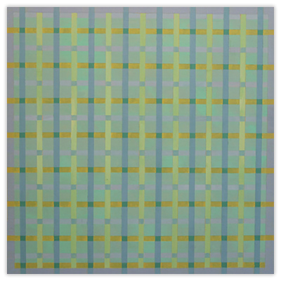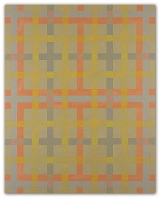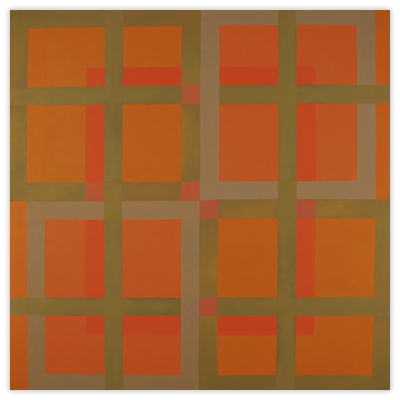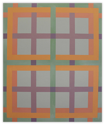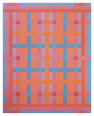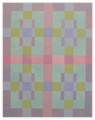 Most recent paintings are representations of window lattices (not literal) as musings on indeterminate space, depth, and surface, with suggestions of figure/ground ambivalence and hue change. The entirely symmetrical use of form is not immediately apparent to most viewers of these works because, I think, other visual aspects seem to point to other considerations and effects that are a result of a special interest in this kind of abstraction.