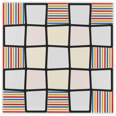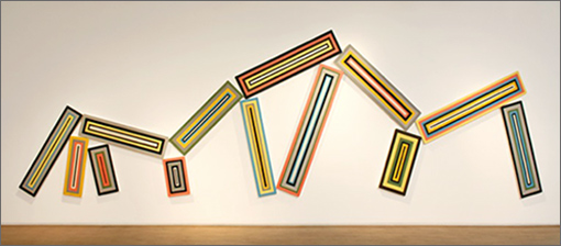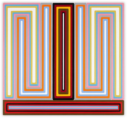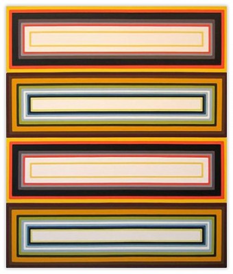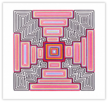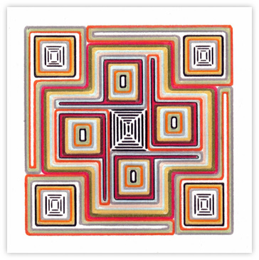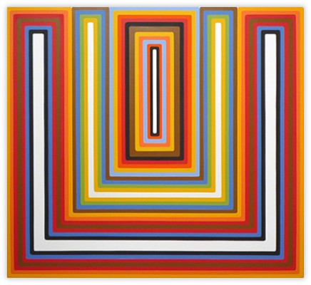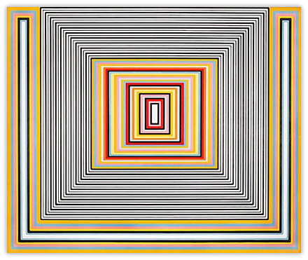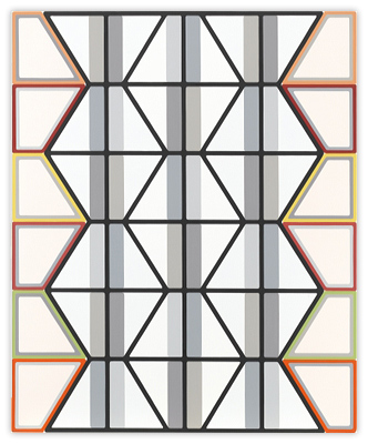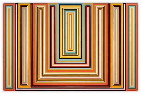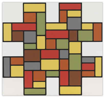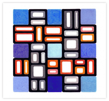 I concentrate on the relationship the colors have to each other one at a time, with each carefully mixed to activate those next to it. It can take hours to mix the particular yellow I need to light up the adjacent orange. I use black as a form of punctuation to emphasize and define the luminosity of color, while white is used both as positive and negative space. A goal is for the intensity of the color relationships to render them equal to the forms they inhabit.