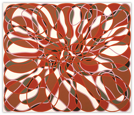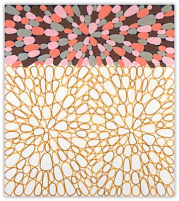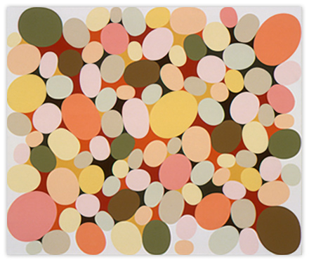 In my earlier paintings, pastel ovoids accumulated within each canvas like dividing cells crowding a Petri dish or rounded stones fitted to each other’s curves to create a wall—a primordial, original architecture. The forms were, and still are, self-referential in the way that nature repeats a shape or unit, multiplying, evolving and mirroring itself into infinity.