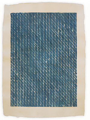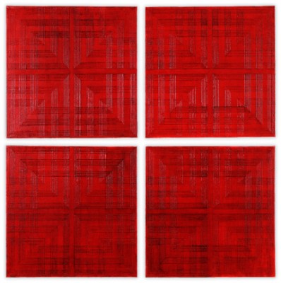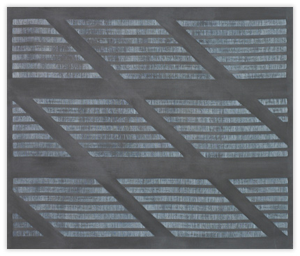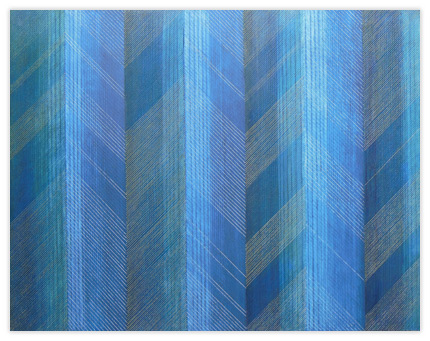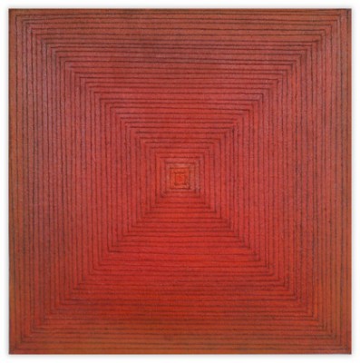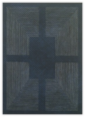 My methods and processes incorporate a variety of materials, which creates a fine complex geometric interpretation within an almost monochrome aesthetic. The use of common thread as a unique mark making tool to create complex lineal rhythms has been an important part of these non-figurative geometric works. It is a tool that can be either left imbedded in paint or removed selectively from the surface, and can be used to reflect light, to tear collaged paper, or create a fine lineal emphasis within a soft edge elusive abstraction. The opportunity of endless development and interpretation is ever intriguing.